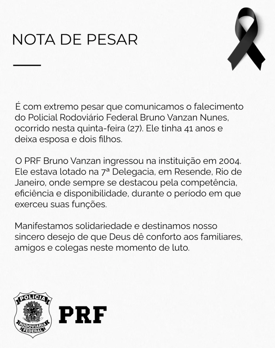 Em nota, a Polícia Rodoviária Federal lamentou a morte e manifestou solidariedade aos parentes, amigos e colegas de Bruno.