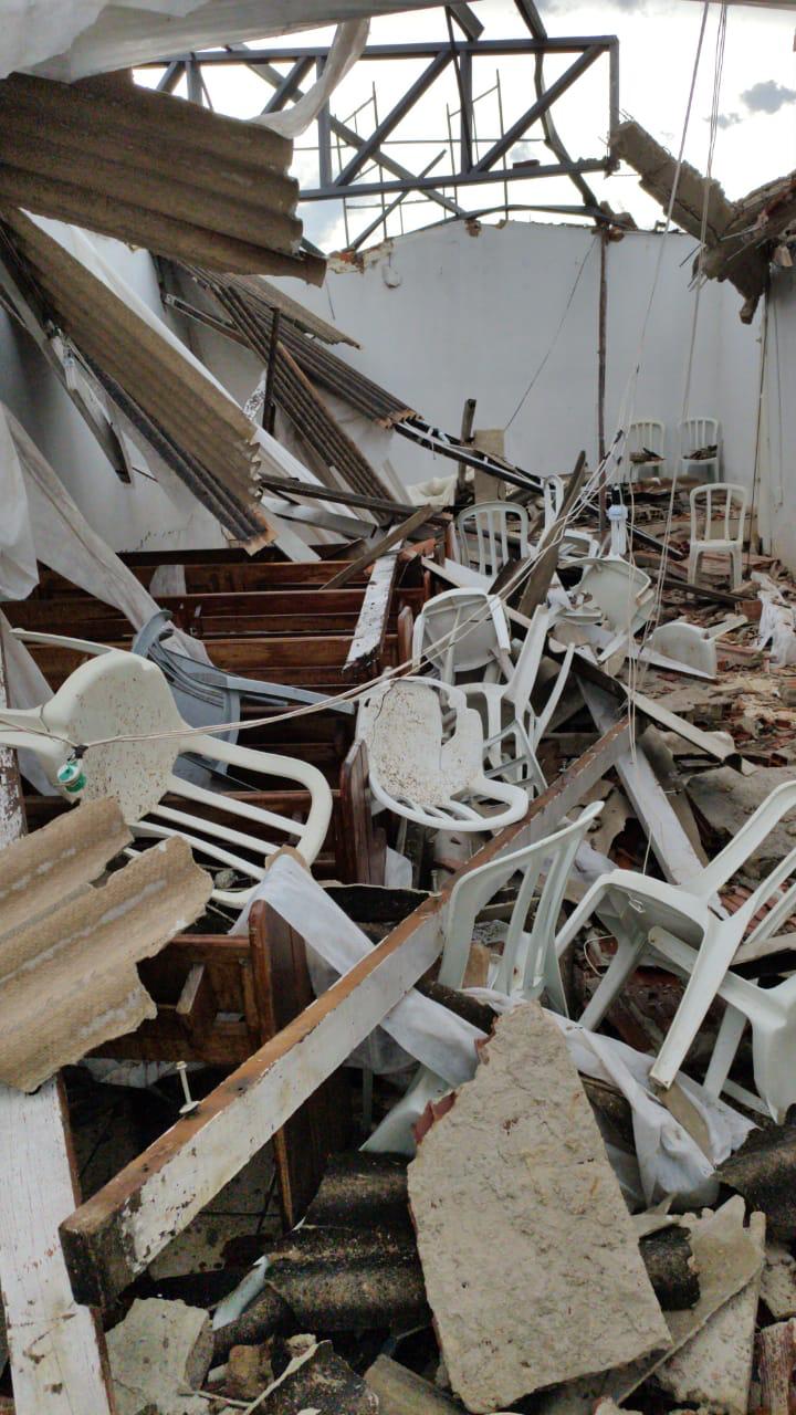 Ventos fortes derrubaram estrutura do novo templo construído próximo a outro prédio, que também ficou destruído