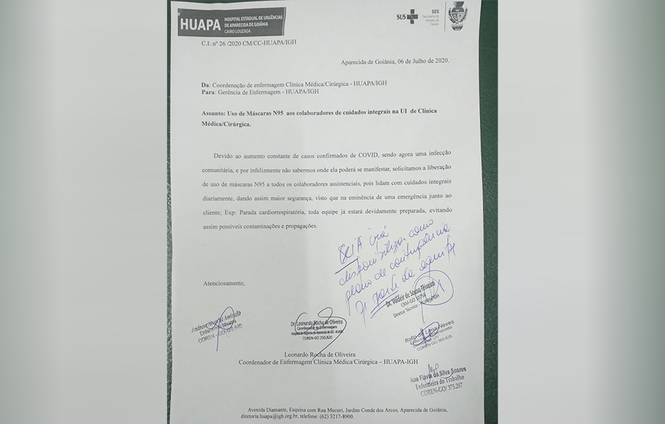 Funcionários do Hospital de Urgências de Aparecida de Goiânia (Huapa) denunciaram a falta de Equipamentos de Proteção Individual (EPI) para lidar com pacientes infectados com o coronavírus. De acordo com a reclamação, os colaboradores estão cuidando das pessoas sem a máscara N-95, indicada para os profissionais de saúde. Direção da unidade afirma que denúncia não procede.