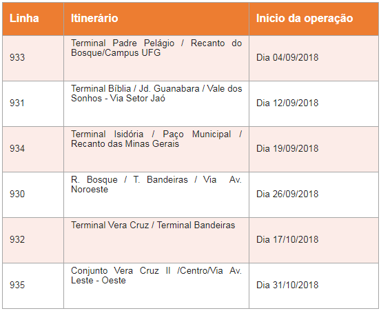 Ao todo, as seis novas linhas, que serão lançadas até o dia 31 de outubro, vão representar 11,5 mil quilômetros rodados, diariamente, e 44 mil novos lugares. A segunda linha a ser lançada será a 931, no próximo dia 12 de setembro. Saindo do Terminal Praça da Bíblia, os coletivos vão passar pelos setores Jardim Guanabara, Vale dos Sonhos e Jaó.