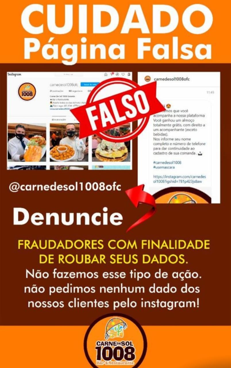 Restaurantes como o 1008 Carne de Sol, Grill Suíço Bar e Restaurante e Brioso e Manhoso são alguns exemplos. Pelas redes sociais, os estabelecimentos publicaram alertas avisando seus clientes dos perfis falsos.