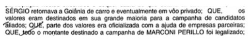 Preso e interrogado na Cash Delivery, o ex-coordenador de campanha do governador José Eliton (PSDB), ex-presidente da Agência Goiana de Transportes e Obras (Agetop) e considerado braço direito de Perillo, Jayme Rincon, revelou que o Policial Militar (PM) e encarregado de buscar valores da Odebrecht em São Paulo, Sérgio Rodrigues de Souza, retornava à Goiânia carro ou de voo particular. Também disse que os valores obtidos eram destinados “em sua grande maioria” para campanha de candidatos aliados. “Parte dos valores era oficializada com ajuda de empresas parceiras e todo o montante destinado à campanha de Marconi Perillo foi legalizado”.
