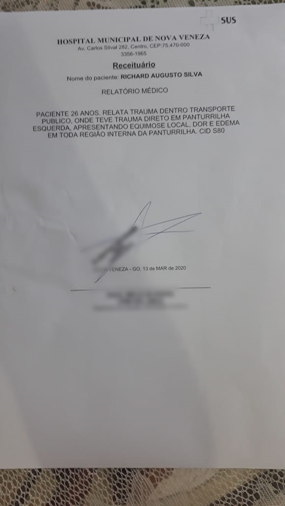 No laudo concebido pelo médico que o atendeu destaca “trauma direto em panturrilha esquerda, apresentando equimose local, dor e edema em toda região interna da panturrilha.” Ele conta que o motorista recebeu uma ligação da empresa de ônibus e que uma mulher falou com ele. “Ela me perguntou apenas se eu queria ir para o hospital. Eu disse que não precisava. Ai ela falou apenas um ‘tudo bem'”, destaca.
