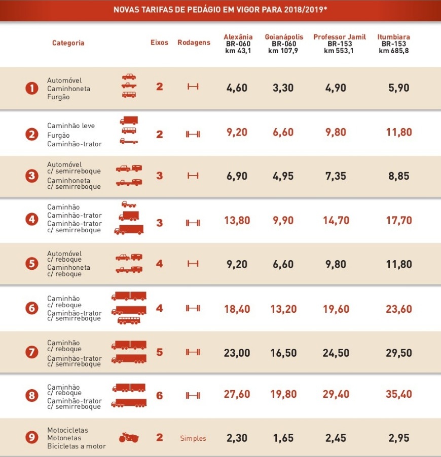 Os valores cobrados por praças de pedágios que passam por Goiás, Minas Gerais e Distrito Federal ficarão mais baratos a partir desta quarta-feira (5). Diante da publicação da Agência Nacional de Transportes Terrestres (ANTT) no Diário Oficial da União, ocorrido no último domingo (3), as rodovias contempladas são as BRs 060, 153 e 262. A nova tabela terá validade até setembro de 2019.