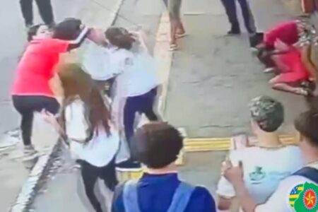 BRIGA GENERALIZADA Casal é preso após invadir colégio e agredir mãe de aluna em Aparecida de Goiânia Briga foi generalizada e envolveu mães de alunos e até os estudantes em escola de Aparecida de Goiânia (Foto: Divulgação - PMGO) há 2 mêss