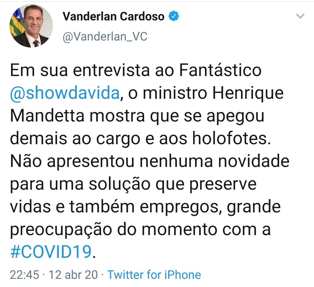 Na final da noite de domingo (12), após entrevista que Mandetta concedeu ao Fantástico, Vanderlan usou sua conta no Twitter para criticar o ministro. O senador disse que o cargo dele pertence ao presidente Jair Bolsonaro e que se ele não concorda com as atitudes presidenciais, deveria pedir para sair. “É uma questão de respeito e hierarquia. Está ficando ridículo para o ministro”.