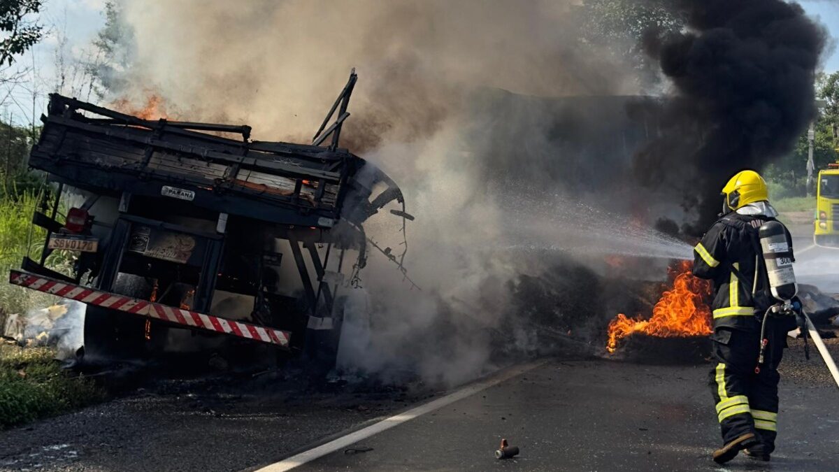 Um acidente na BR-153, km 140, deixou quatro pessoas mortas e uma ferida nesta sexta-feira (13/12). A colisão frontal envolveu dois caminhões e provocou um incêndio de grandes proporções.