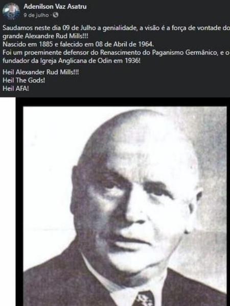 O subinspetor da GCM Adenilson Vaz da Costa, afastado do cargo após ser acusado de agressão por moradores da cidade, escreveu em sua página um texto em que saúda a memória de Alexander Rud Mills, um advogado e escritor australiano simpatizante ao nazismo. Ele celebra Mills como um “proeminente defensor do Renascimento do Paganismo Germânico” e “fundador da Igreja Anglicana de Odin”.