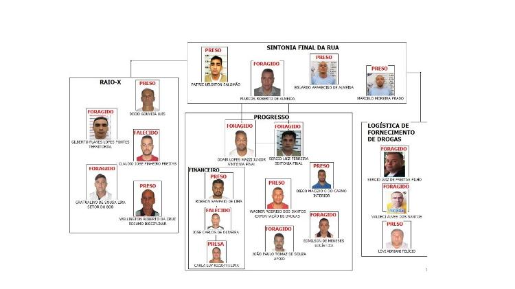 O organograma montado pelo MP começou com a prisão de Robson Sampaio de Lima, 37, conhecido como Tubarão, e mais quatro pessoas, em 2018. Apontado como contador da facção, com ele, foi apreendido um notebook e três cadernos com contabilidade do crime.