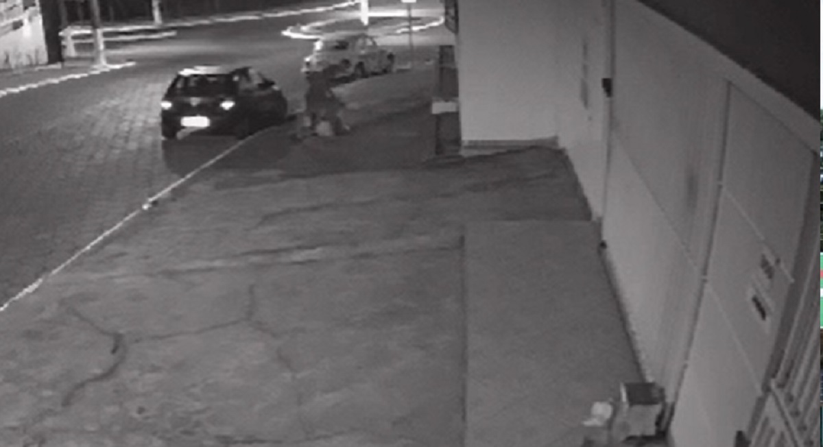 Câmeras de segurança mostram o momento em que o agressor a derruba no chão. O jovem joga a adolescente no chão, bate e a arrasta.