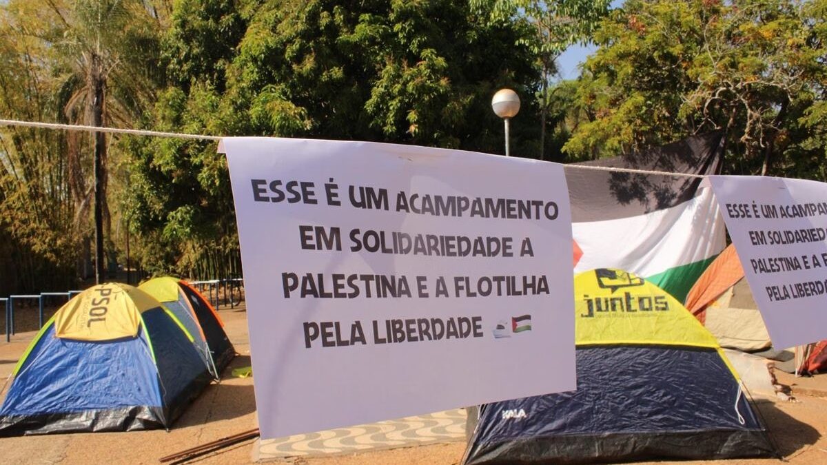 Um grupo de alunos da UnB fizeram acampamento em defesa dos palestinos em Gaza nesta segunda-feira (15), no Campus Darcy Ribeiro, em Brasília. A mobilização é organizada pelo Diretório Central dos Estudantes (DCE) e pelo Coletivo Juntos, em solidariedade ao povo palestino e à flotilha humanitária que segue rumo à Faixa de Gaza.