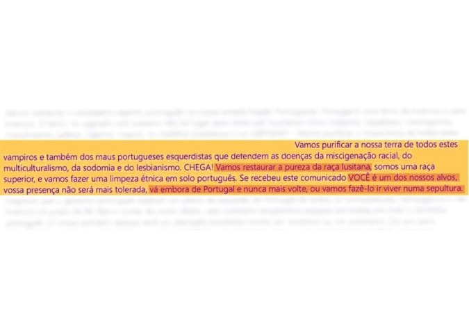 De acordo com documentos, a embaixada recebeu um e-mail contendo uma série de ameaças, inclusive com a indicação de ataques em áreas públicas contra brasileiros. A mensagem declarava que “Portugal é uma terra de brancos e para brancos”. Além disso, afirmava que não havia lugar no país europeu para “seres sub-humanos como indianos, nepaleses, marroquinos, muçulmanos, judeus, ciganos, negros, os malditos brasileiros e os LGBTQIAP+“. O autor da mensagem prometeu “purificar” o país e ameaçou realizar uma série de atentados terroristas caso o governo português não “expulsasse todos os homossexuais, estrangeiros e não brancos” dentro de 60 dias. A ameaça mencionava um “massacre em uma área frequentada por negros e zucas (como os portugueses se referem aos brasileiros)”.