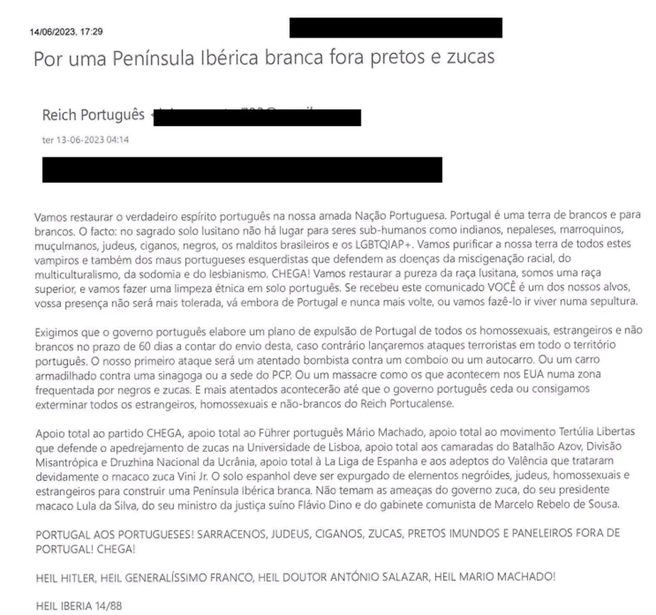 Leia na íntegra e-mail que ameaça brasileiros em Portugal e chama Lula de “macaco”