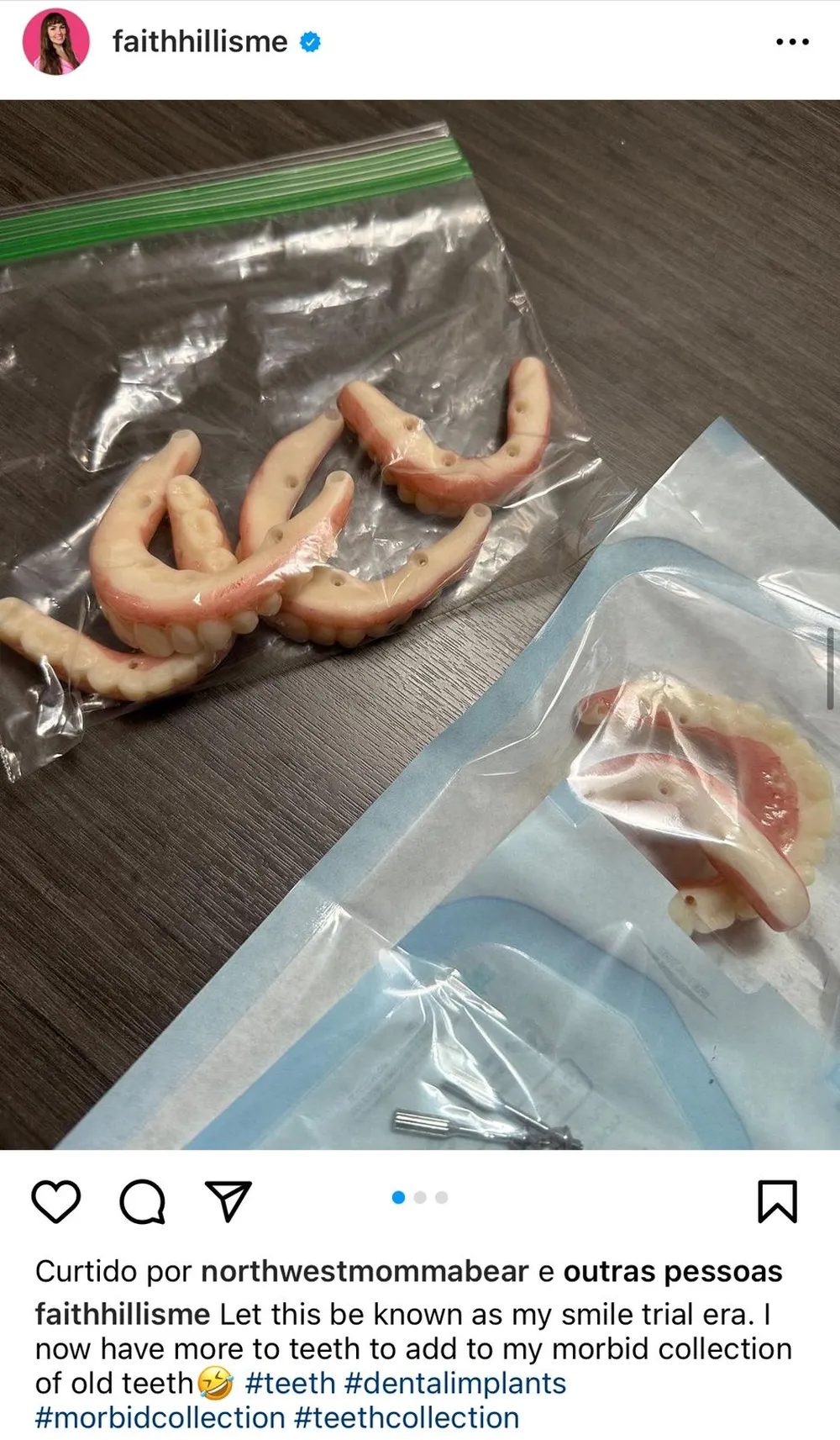 “Que esse post seja conhecido como minha era de teste do sorriso. Agora tenho mais dentes para adicionar à minha coleção mórbida de dentes velhos”, escreveu em uma publicação de outubro onde publicou foto de quatro dentaduras antigas e dois dos seus novos sorrisos.