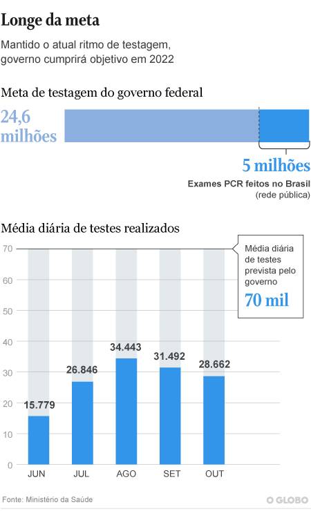 Enquanto as atenções se voltam para a possível descoberta de uma vacina contra a Covid-19, o plano de testagem no Brasil patina. Desde setembro, a quantidade de exames moleculares (do tipo PCR, adequados para fazer diagnóstico) realizados por mês na rede pública está em queda. Mantido o ritmo atual, a meta do Ministério da Saúde, de chegar a 24,6 milhões de testes ainda em 2020, só será atingida em um ano e 10 meses, ou seja, por volta de agosto de 2022.