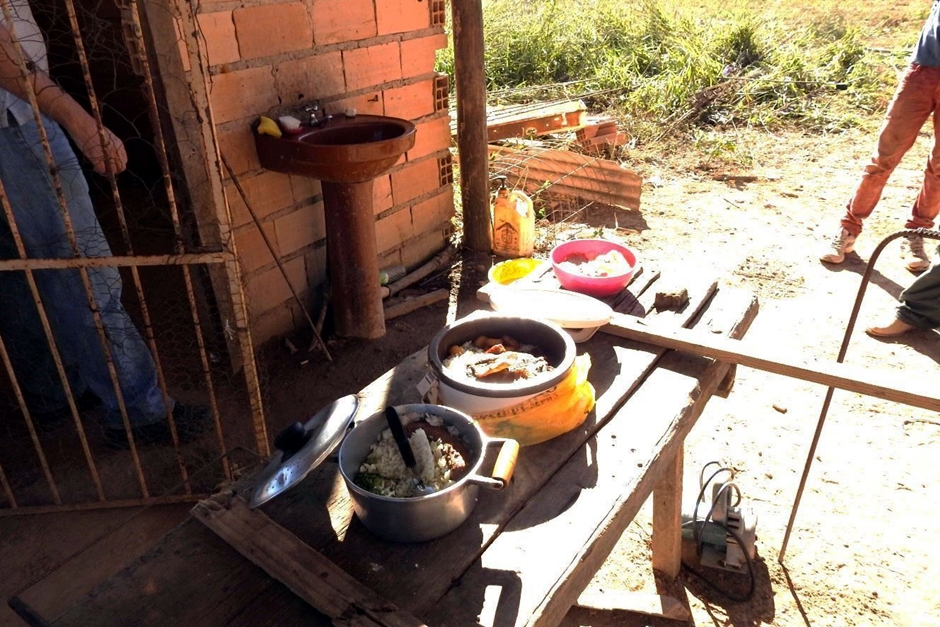 O empregador também não fornecia refeições ou água para beber. Na obra não havia instalações sanitárias ou refeitório. Os obreiros tinham que fazer suas refeições ao lado de um pequeno barraco, onde havia um fogão velho usado para aquecer os alimentos, próximo a poças de lama. O grupo dormia numa pequena sala adjacente ao galpão principal, ainda em construção, em colchões colocados no piso, sem cama, iluminação e armários, e tomavam banho com mangueira ou água estocada em tambores para uso da obra.