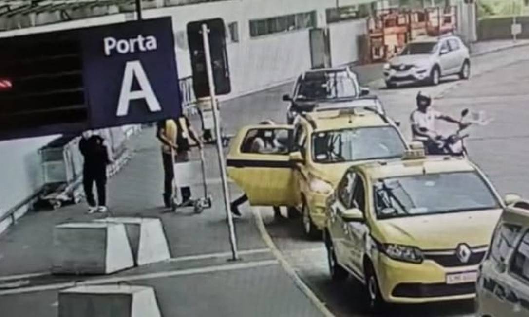 Imagens de segurança mostram a ação dos bandidos desde o início, quando dois homens rondam a fila de táxis do desembarque. O motorista, inclusive, chega a andar por alguns metros na contramão. O garupa deixa a moto, mas não tira o capacete. É ele quem ataca a vítima, ainda dentro do carro, rouba os pertences, volta para a moto, e foge em seguida.