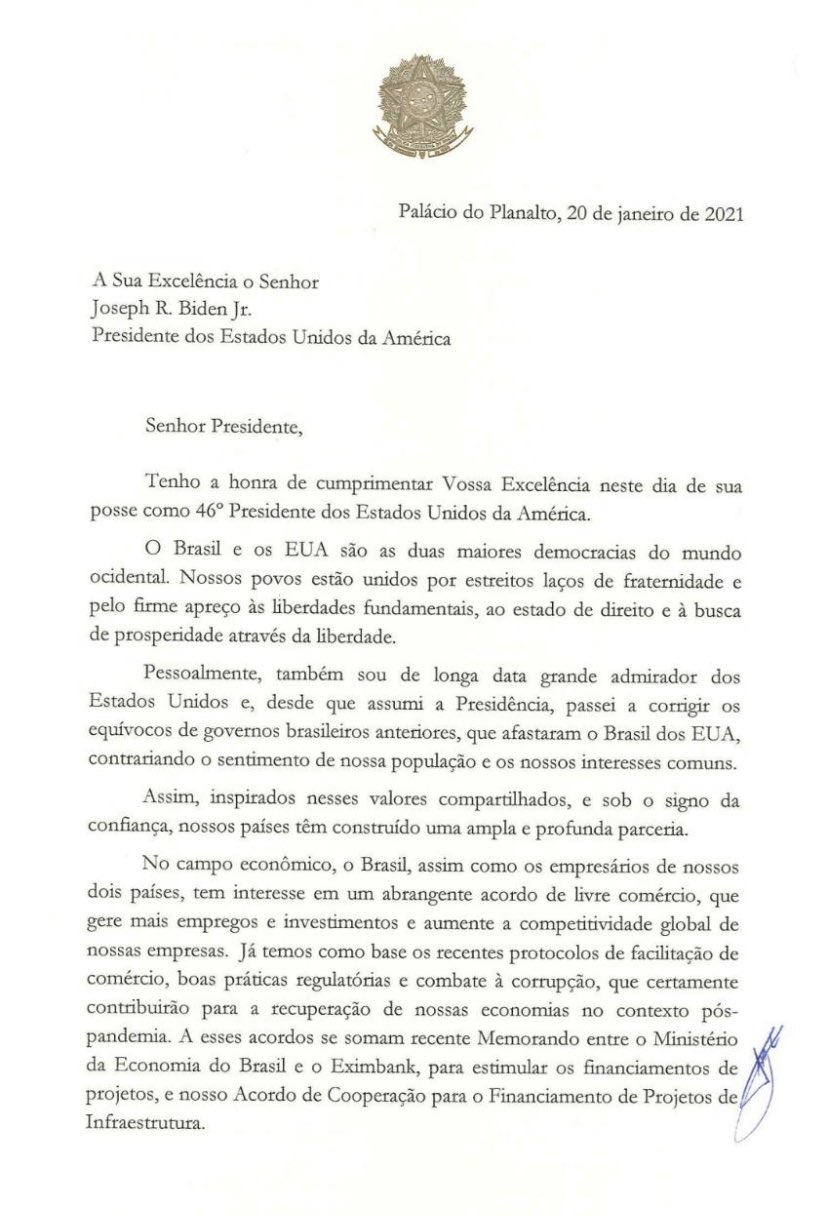 Bolsonaro anunciou pelo Twitter que enviou uma carta ao presidente dos Estados Unidos Joe Biden, que tomou posse nesta quarta-feira (20). “Para marcar essa data, enderecei carta ao Presidente dos EUA, Joe Biden, cumprimentando-o por sua posse e expondo minha visão de um excelente futuro para a parceria Brasil-EUA.”