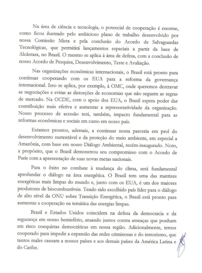 “Brasil e Estados Unidos coincidem na defesa da democracia e da segurança em nosso hemisfério, atuando juntos contra ameaças que ponham em risco conquistas democráticas em nossa região. Adicionalmente, temos cooperado para impedir a expansão das redes criminosas e do terrorismo, que tantos males causam a nossos países e ados demais países da América Latina e do Caribe”, escreveu em trecho.