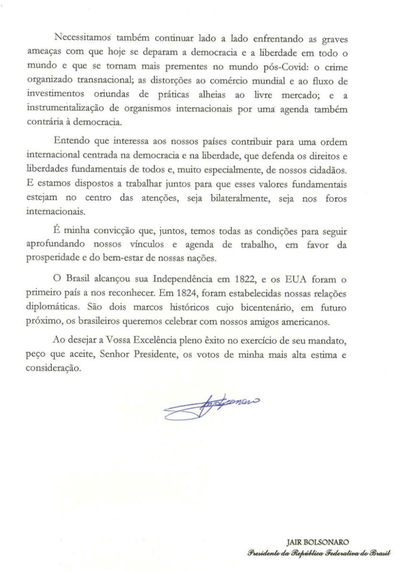 Para marcar essa data, enderecei carta ao Presidente dos EUA, Joe Biden, cumprimentando-o por sua posse e expondo minha visão de um excelente futuro para a parceria Brasil-EUA: