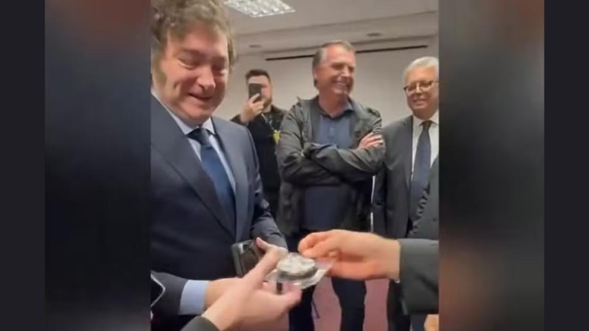 Bolsonaro lhe entregou a medalha e, segundo pessoas que estavam no encontro, Milei agradeceu. O momento foi registrado em vídeo por Eduardo Bolsonaro.