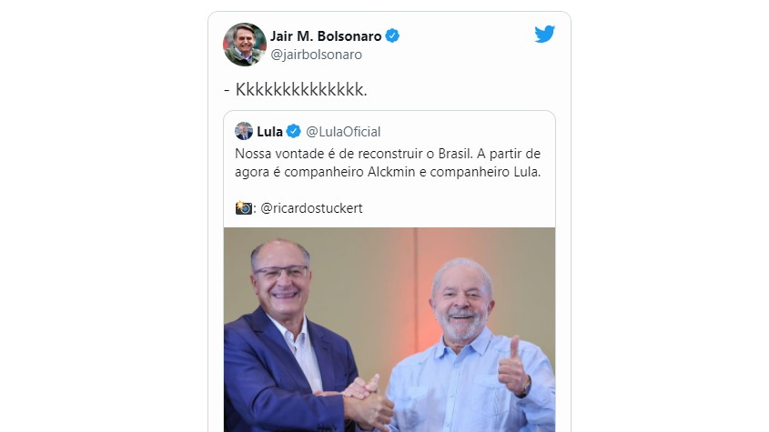 Bolsonaro compartilhou no Twitter uma foto de Lula e Alckmin, publicada no perfil do ex-presidente, e escreveu: “Kkkkkkkkkkkkkk”. Na imagem, os aliados dão as mãos e o petista faz um gesto positivo para a câmera. “Nossa vontade é de reconstruir o Brasil. A partir de agora é companheiro Alckmin e companheiro Lula”, escreveu o ex-presidente.