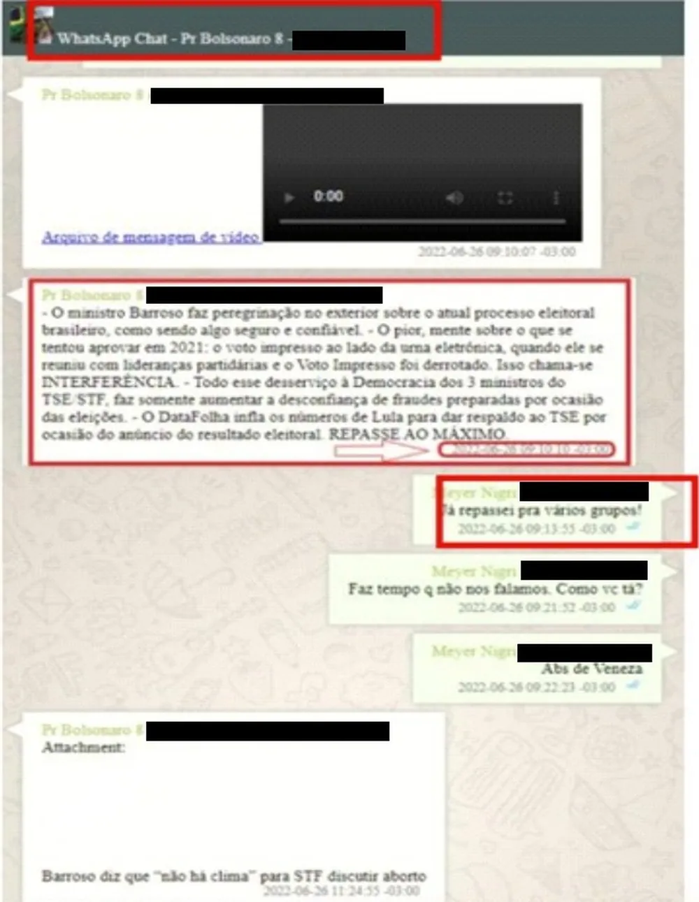O então presidente Jair Bolsonaro solicitou a um empresário para “repassar ao máximo” uma mensagem que insinuava, sem provas, uma fraude do Tribunal Superior Eleitoral (TSE) nas eleições do ano passado. O texto ainda continha ataques ao ministro Luís Roberto Barroso, do Supremo Tribunal Federal (STF).