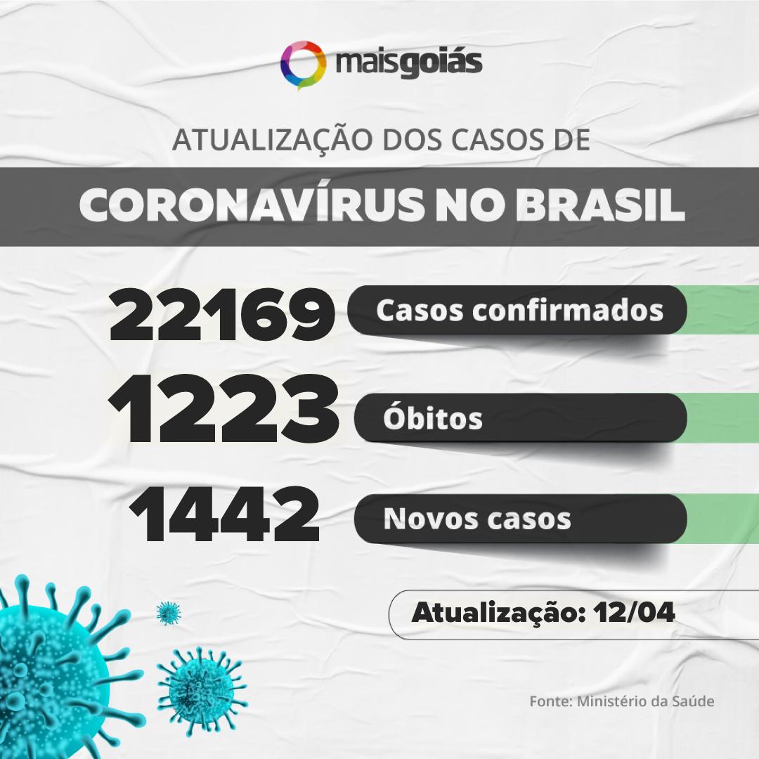 O Ministério da Saúde anunciou hoje que subiu para 1.223 o número de mortes registradas pelo novo coronavírus no Brasil — 99 óbitos confirmados nas últimas 24 horas. Até sábado (11), eram 1.124 mortes. No total, são exatos 22.169 casos oficiais até agora — aumento de 1.442 diagnósticos em um único dia —, segundo o Ministério.