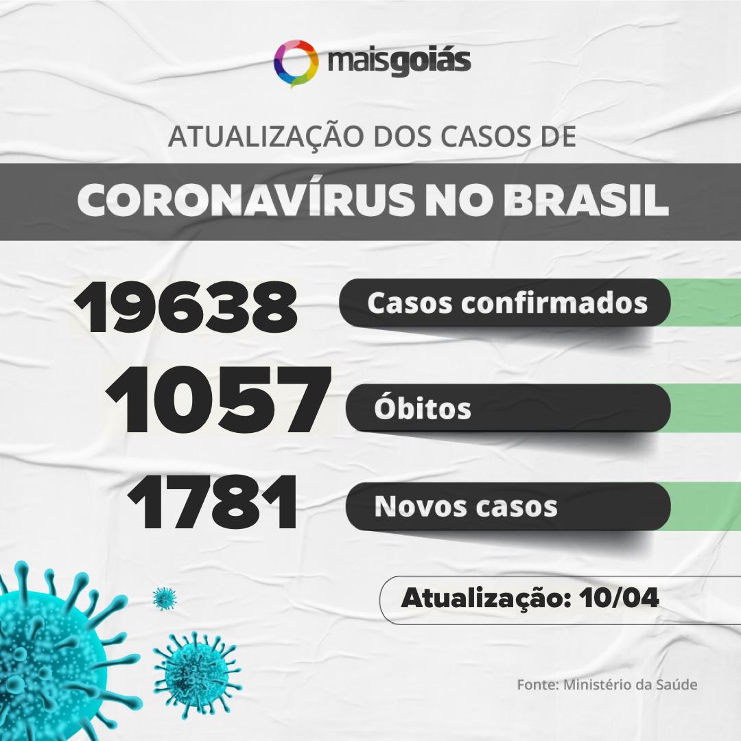 O Ministério da Saúde divulgou nesta Sexta-Feira Santa (10) os números atualizados do novo coronavírus no Brasil. De acordo com a pasta, o número de infectados, no momento, é de 19.638, o que representa aumento de 1.781 casos em relação ao balanço divulgado na quinta (9). Além disso, o número de mortes superou os mil registros. Até o momento, foram registrados 1.057 óbitos pela doença. A taxa de letalidade do vírus no Brasil é de 5,4%.