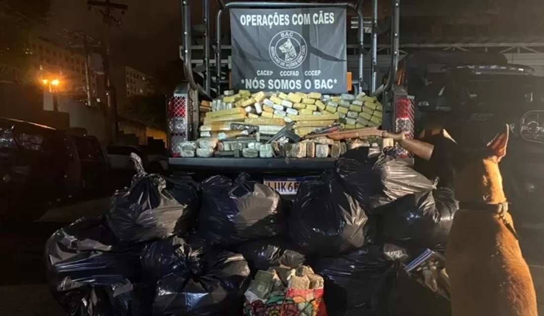 A Polícia Militar do Rio de Janeiro aprendeu cerca de uma tonelada de drogas e armas com a ajuda da cadela Nascar na noite desta quinta-feira (13). De acordo com a corporação, equipes do Batalhão de Ações com Cães (BAC) realizavam um policiamento na avenida Dom Helder Câmara, na altura do bairro Jacaré, quando o animal teve a sua atenção voltada para um local nas imediações.
