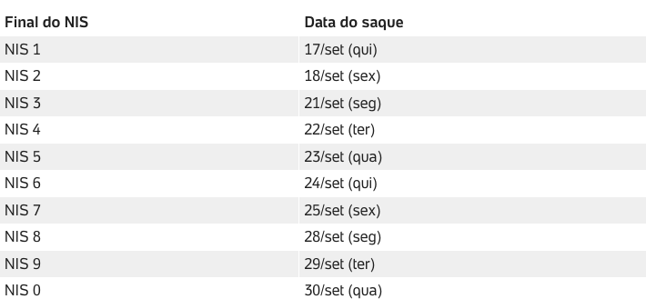 Os saques serão liberados a cada dia útil de acordo com o dígito final do NIS, seguindo o calendário abaixo: