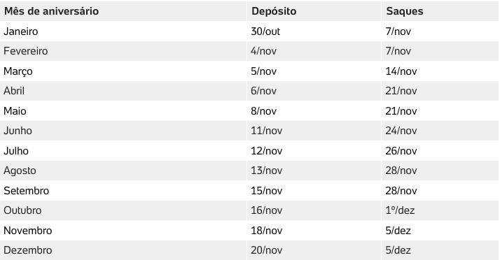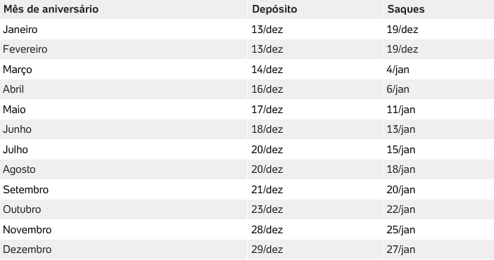 No total, serão seis ciclos de pagamento, com depósitos até 29 de dezembro e saques até 27 de janeiro.