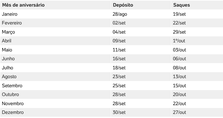 Os saques da 6ª parcela foram autorizados em setembro. A 7ª parcela será liberada entre 19 e 30 de outubro, conforme o último dígito do NIS (Número de Identificação Social) —começando pelo 1 e terminando pelo 0.