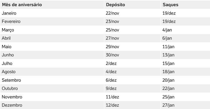 No total, serão seis ciclos de pagamento, com depósitos até 29 de dezembro e saques até 27 de janeiro.