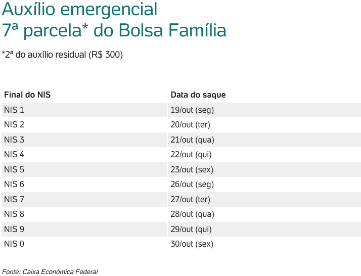 Até 30 de outubro, todos do Bolsa Família que têm direito ao auxílio residual poderão sacar a segunda parcela de R$ 300 (ou R$ 600 para mulheres chefe de família). Os saques serão liberados por ordem do dígito final do NIS.