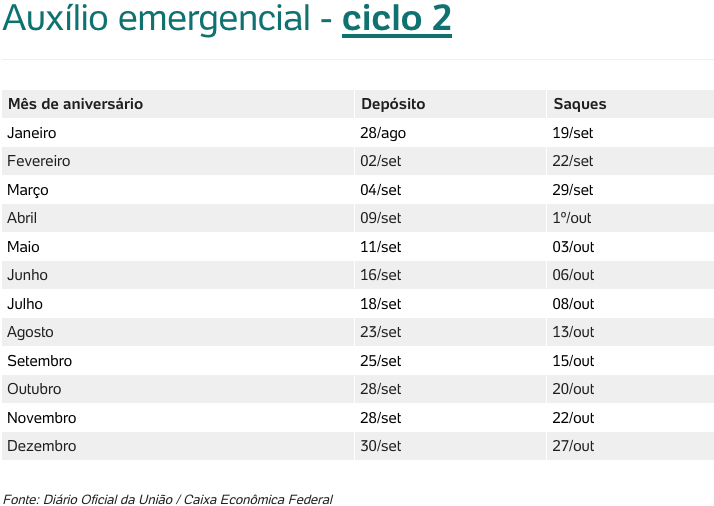A Caixa chama de ciclo cada calendário em que todos os beneficiários do auxílio emergencial (exceto os do Bolsa Família) recebem pelo menos uma parcela, independente de qual seja. Esses cronogramas seguem por ordem do mês de aniversário, começando com os nascidos em janeiro e terminando com os de dezembro.