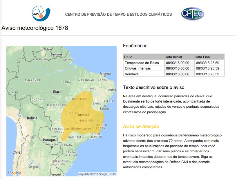 O Centro de Previsão de Tempo e Estudos Climáticos CPTEC emitiu aviso meteorológico que alertava as populações de diversos municípios sobre a ocorrência de tempestades com raios, chuvas intensas e vendavais. Veja área destacada em amarelo, a qual inclui a cidade de Caldas Novas, na imagem: