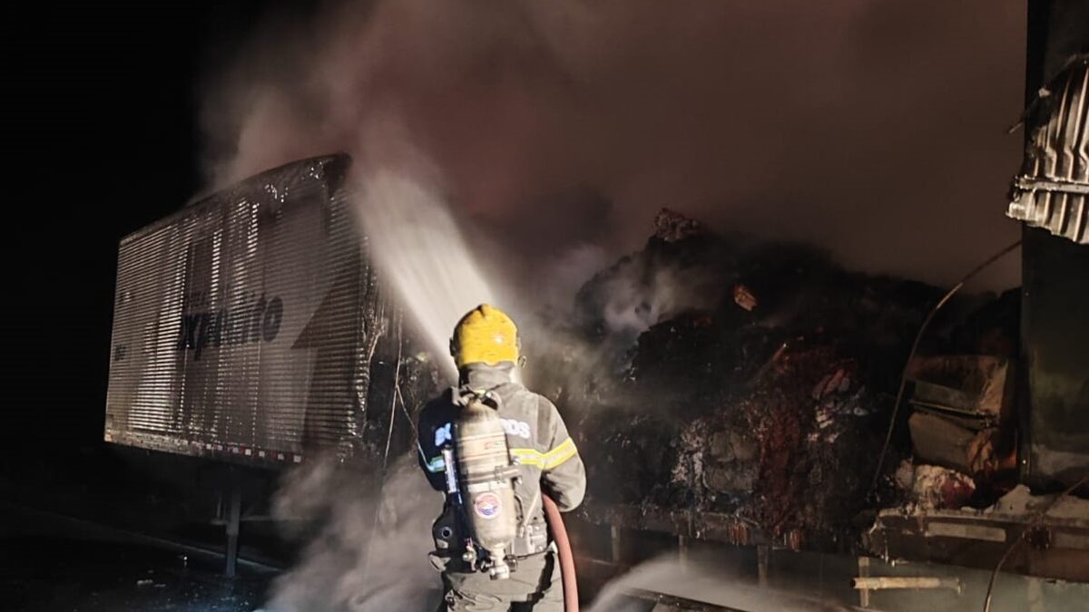 Um caminhão baú carregado com diversas mercadorias pegou fogo na madrugada desta quinta-feira (23). O incidente ocorreu no quilômetro 10 da GO-080, no sentido Goiânia – Nerópolis, após a barreira policial.