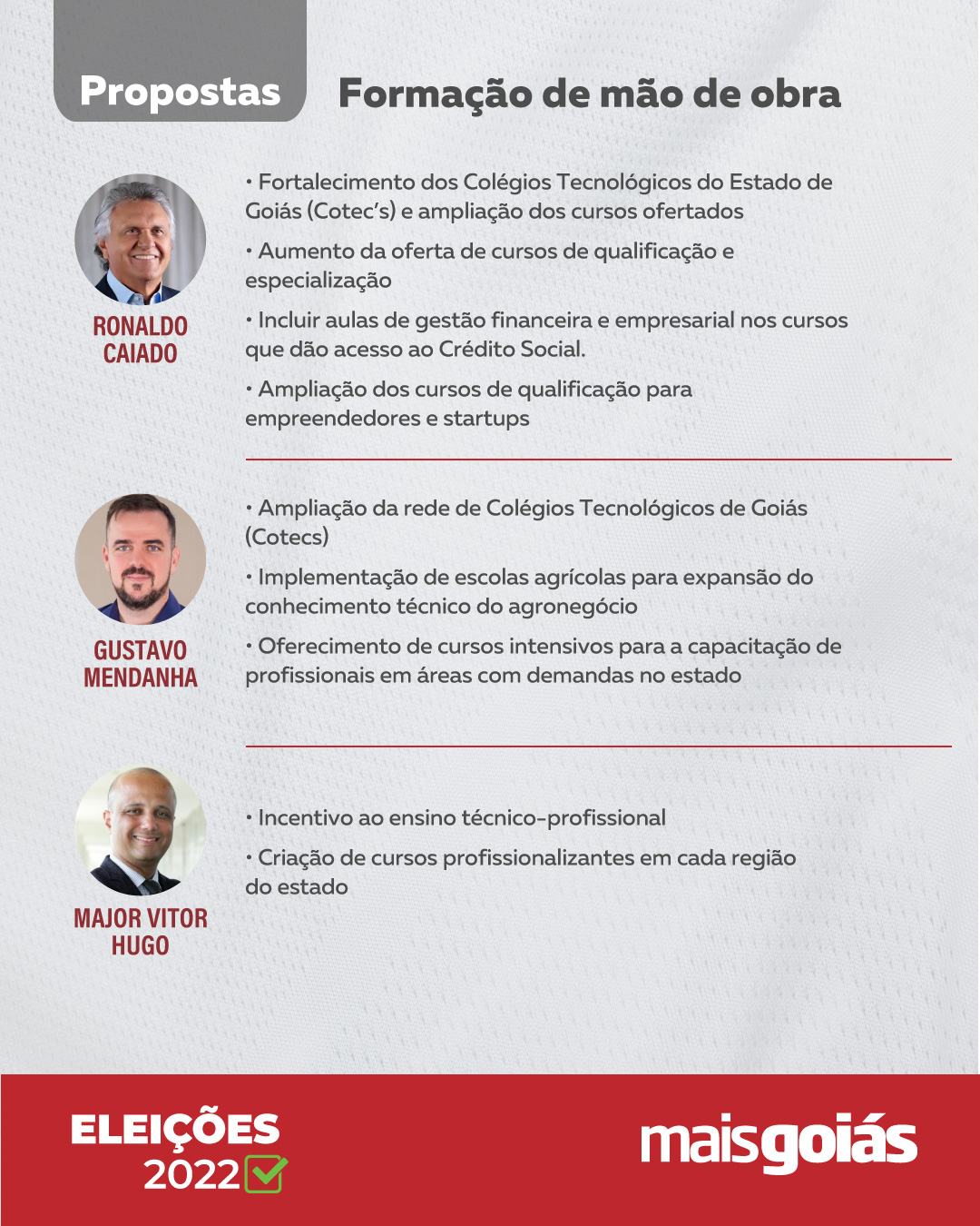 Uma das mais frequentes reclamações das indústrias e do mercado em geral refere-se à falta de mão de obra qualificada. Segundo estudo realizado pela consultoria de recursos humanos ManpowerGroup em junho de 2022, o Brasil ocupou a 9ª posição de países com mais falta de profissionais qualificados. Em Goiás, a realidade não é diferente. No início de 2022, por exemplo, a construção civil abriu cerca de mil vagas de trabalho no estado, mas não conseguiu preenchê-las completamente em razão da falta de trabalhadores qualificados, segundo levantamento do Sindicato da Indústria da Construção no Estado de Goiás (Sinduscon-GO). Ronaldo Caiado (União Brasil), Gustavo Mendanha (Patriota) e Major Vitor Hugo (PL), candidatos ao governo estadual, falam sobre as pretensões para solucionar a problemática.