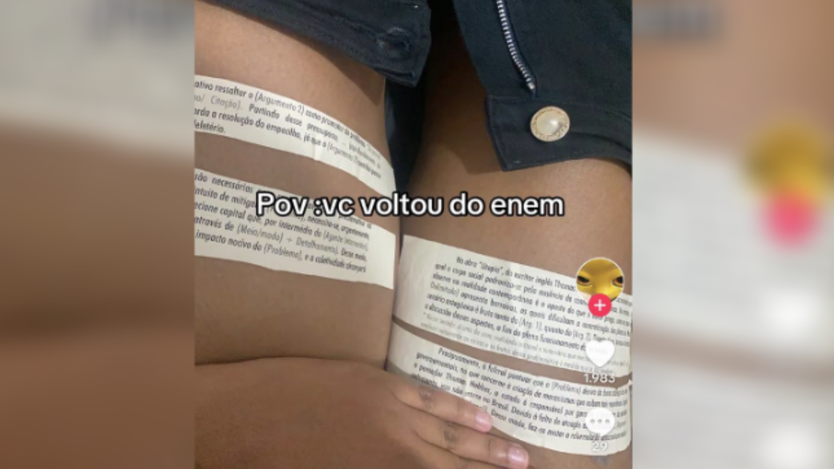 Diversos candidatos do Exame Nacional do Ensino Médio (Enem) 2024 utilizaram as redes sociais para relatar o uso de “colas” na prova de redação, realizada no último domingo (4). Em publicações no aplicativo TikTok, jovens mostraram fotos com modelos prontos de redação que imprimiram e esconderam para reproduzir no teste.