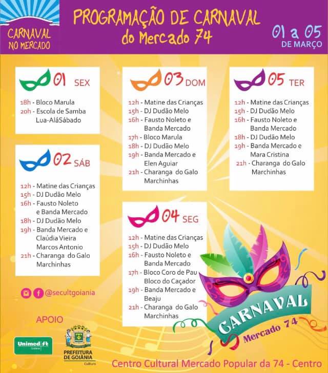 Shows, blocos carnavalescos e até apresentação de escolas de samba fazem parte da programação diversificada do Mercado da Rua 74 no Carnaval deste ano. “A ideia é promover um baile tradicional para toda a família e amigos num ambiente animado e acolhedor”, ressalta o organizador do evento, Fausto Noleto. A festa começa na sexta-feira (01) e só termina na terça-feira (05). E o melhor: tudo de graça!