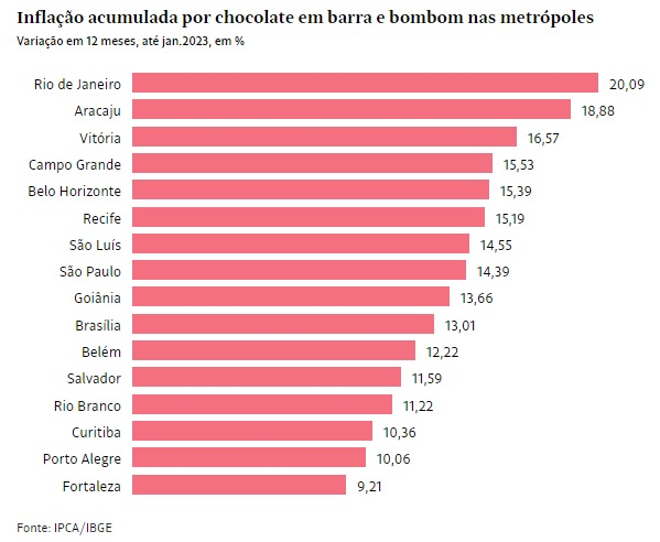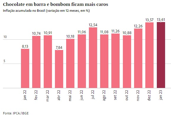 No acumulado até janeiro de 2023, a alta do chocolate em barra e do bombom (13,61%) supera a do grupo alimentação e bebidas (11,07%) e equivale a mais do que o dobro do IPCA geral (5,77%).