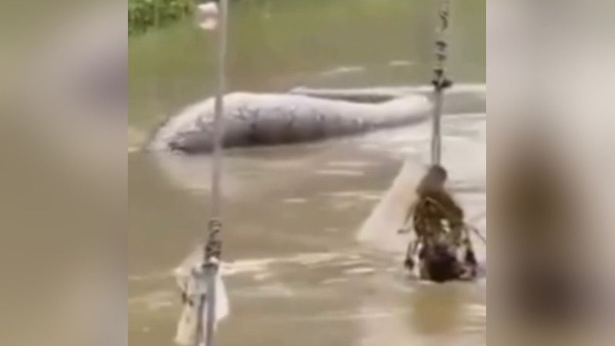 Um vídeo divulgado pelo jornal ABC mostra uma cobra píton gigante de seis metros em meio às enchentes que atingem Pattani, no sul da Tailândia. O réptil, que flutuava nas águas turvas, chamou atenção por sua barriga visivelmente inchada, despertando teorias entre os moradores sobre o que teria ingerido.