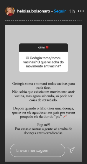 Heloísa Bolsonaro, casada com Eduardo Bolsonaro, disse em uma rede social que a filha recém-nascida “tomou e tomará todas as vacinas” ao responder perguntas feitas por seguidores, nesta terça-feira (24). Segundo ela, “o movimento anti-vacina só poder coisa de retardado”.