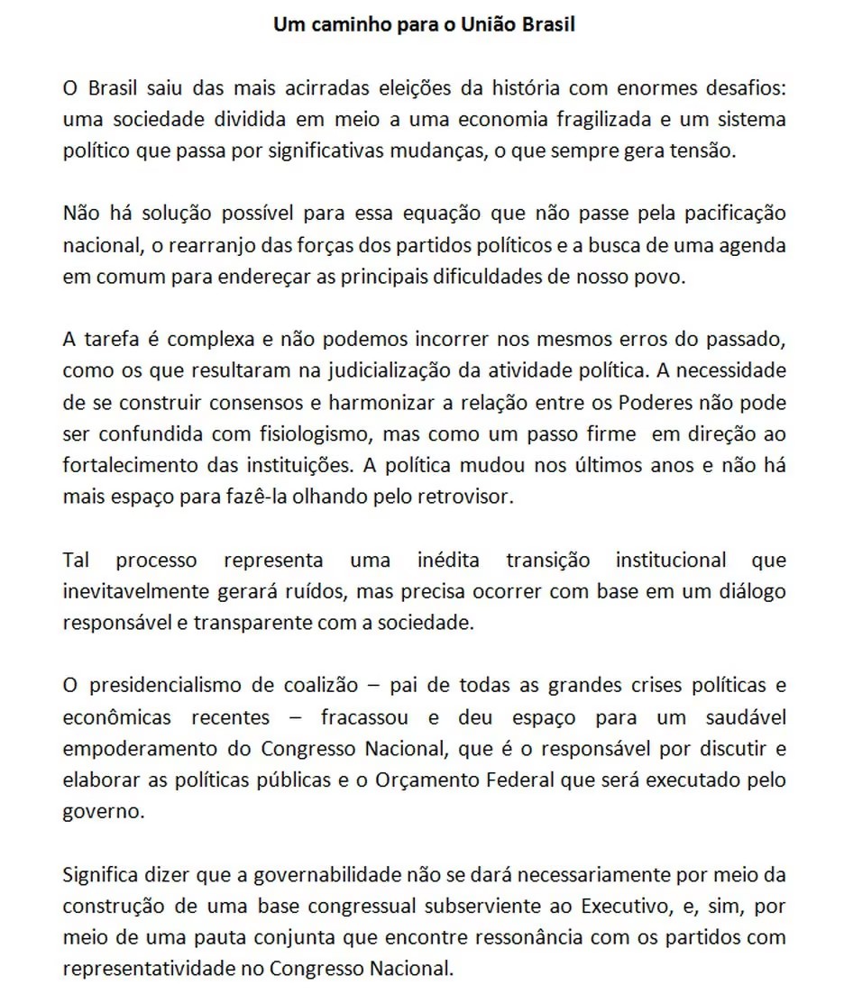 Fruto da fusão entre o DEM e o PSL, o União Brasil não gosta do rótulo de Centrão e sustenta que, no campo ideológico, se posiciona “ao centro” do espectro político. “É evidente que isso não significa uma oposição insensata aos projetos que o governo de Luiz Inácio Lula da Silva venha a apresentar. Há, sempre, espaço para o diálogo e o entendimento. Precisamos construir, e não mais segregar”, diz um trecho do documento.