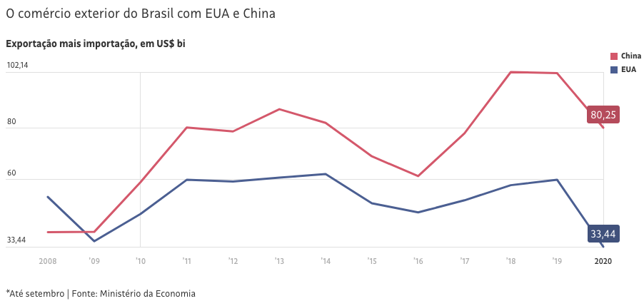 Segundo a Amcham-Brasil (Câmara Americana de Comércio para o Brasil), o comércio entre os dois países registrou até setembro o pior resultado dos últimos 11 anos, com trocas que somaram US$ 33,4 bilhões (25,1% a menos do que o mesmo período do ano passado).
