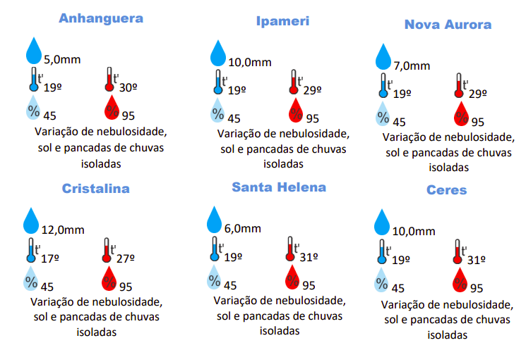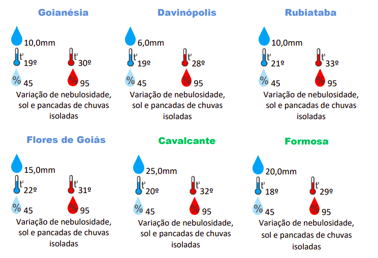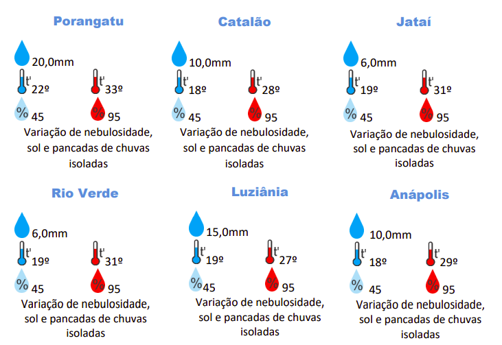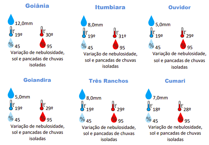 Confira abaixo a previsão do tempo completa deste final de semana em diversos municípios de Goiás.