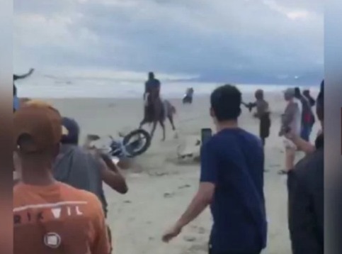 Uma mulher teve o braço quebrado e um cachorro morreu depois de serem atropelados durante uma corrida entre cavalos e motos. O fato foi registrado em uma praia no limite entre as cidades Peruíbe e Itanhaém, no litoral de São Paulo no último dia 5.