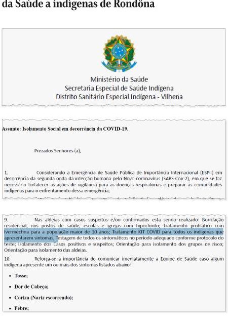 No documento distribuído pelo Distrito Sanitário Especial Indígena (DSEI) de Vilhena (RO) a coordenadores da Fundação Nacional do Índio (Funai) e lideranças indígenas de 144 aldeias da Amazônia, fica clara a recomendação dos medicamentos para “todos os que apresentarem sintomas como dores no corpo, tosse, dor de cabeça, febre, coriza, dificuldade para respirar, dor de garganta, perda do olfato ou paladar”.