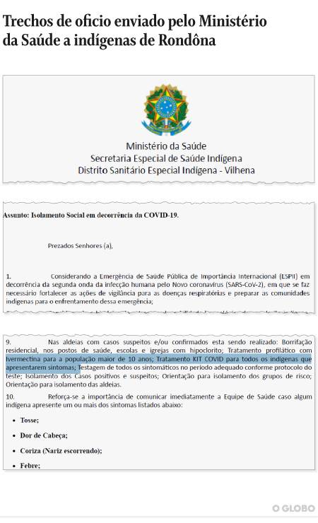 Ofício obtido pelo GLOBO confirma a indicação do “kit Covid” feita pela Secretaria Especial de Saúde Indígena (Sesai), vinculada ao Ministério da Saúde. Ele será enviado à CPI como prova, para que o colegiado possa cobrar providências sobre o que os índios apontam como “abandono e negligência” do governo federal no combate ao vírus entre esses povos.